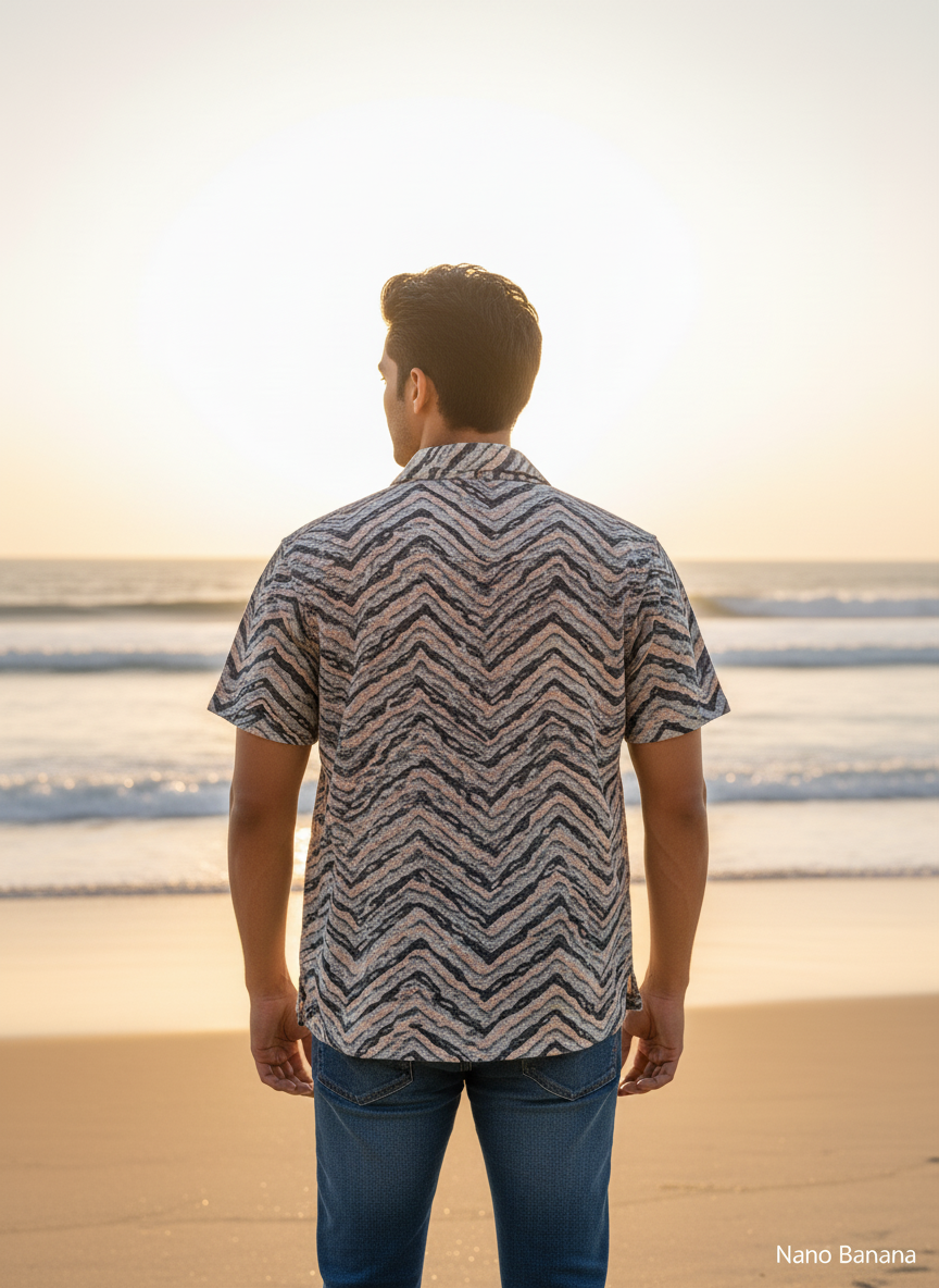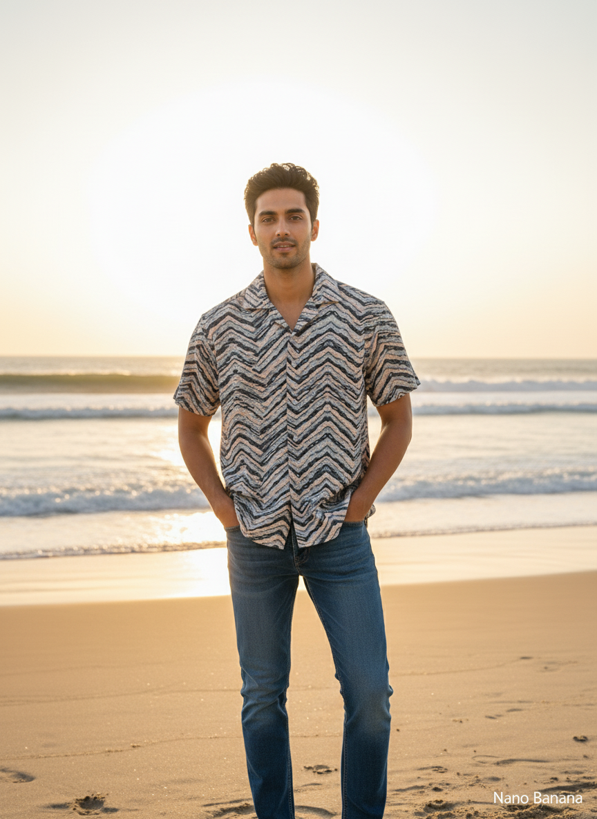 Collar: Modern and breezy Camp Collar (also known as a Cuban collar), which lays flat and open to create a relaxed, resort-wear aesthetic.