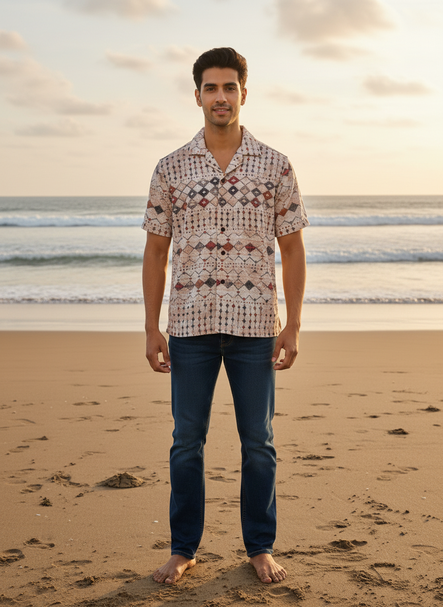 Collar: Modern and breezy Camp Collar (also known as a Cuban collar), which lays flat and open to create a relaxed, resort-wear aesthetic.