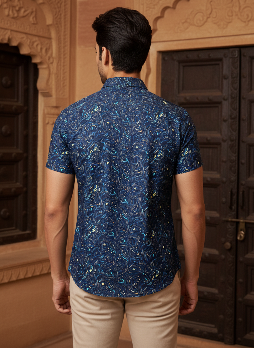 Modern Revere Collar: The open collar adds a contemporary, laid-back resort vibe.